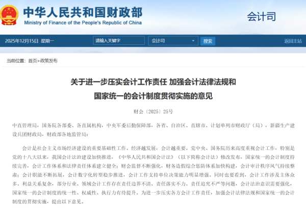 近日,财政部发布财会〔2025〕25号文件,对会计工作责任进行系统性规范。这份被称为“会计责任清单”的文件,标志着会计监管进入新时代。