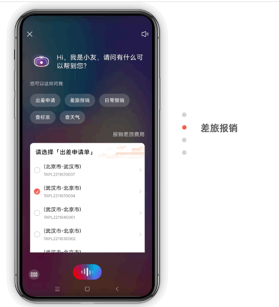 以差旅报销为例,进入友费控APP后,通过说出“差旅报销”,即可快速筛选出当前满足报销条件的出差申请及待报销账单,简单勾选后即可轻松发起报销,全程告别手工输入,动动嘴全搞定!