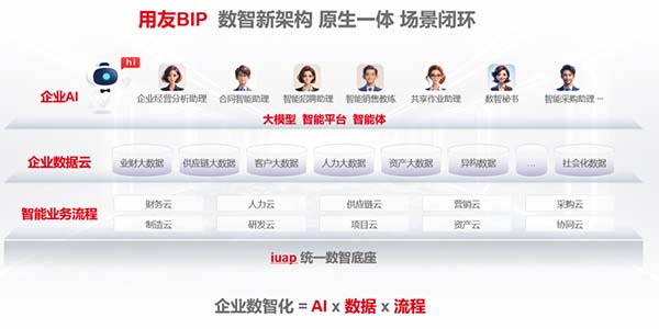 用友BIP超级版以统一数智底座打破信息壁垒,通过 “AI x 数据 x 流程” 一体化架构,提供端到端的一体化场景方案 ,众多智能体深度融入企业运营的核心环节,基于统一的流程和数据,驱动业务和管理智能化运营。