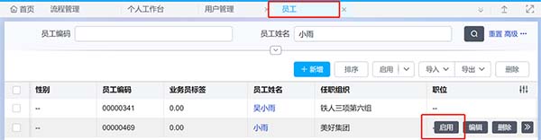 Step2:在员工列表中,鼠标放置目标行,点击启用员工。