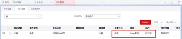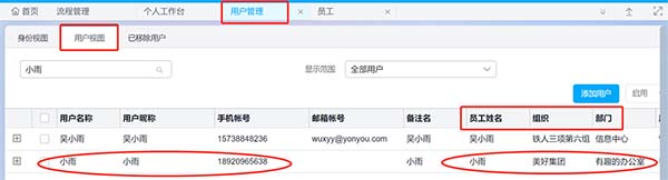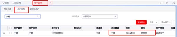 效果展示:用户管理中用户视图下自动生成对应已关联员工的用户账号。