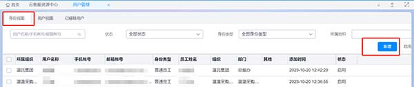 Step1:在 用户管理中进入用户视图,鼠标放置目标行,点击新增身份;